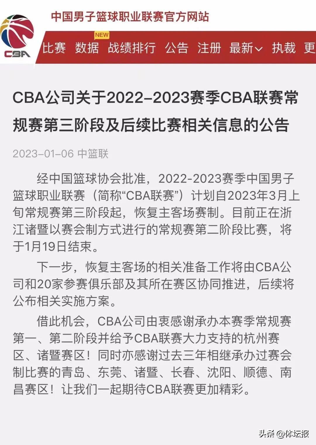 1月6日,CBA公司官方發佈公告,稱計劃自2023年3月上旬常規賽第三階段起,恢復主客場賽制。下一步,恢復主客場的相關準備工作將由CBA公司和20家參賽俱樂部及其所在賽區協同推進,後續將公佈相關實施方案。這是時隔3年後,CBA再次迎來主客場賽制,對於聯賽各球隊、球迷、贊助商等羣體都是期盼已久的好消息。