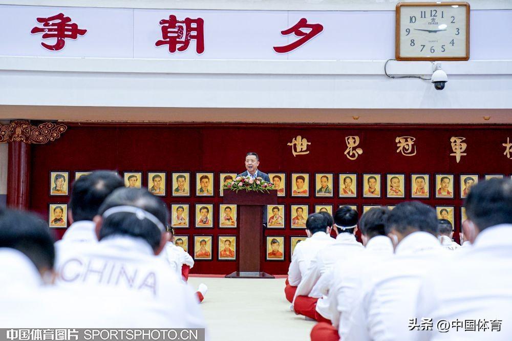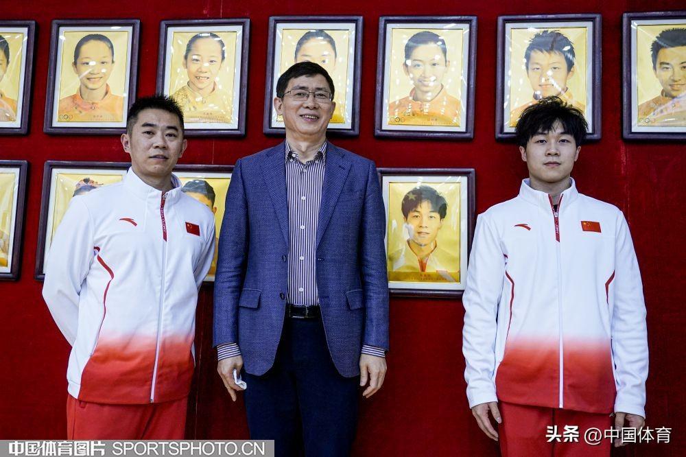 圖爲(左起)教練員陸斌、國家體育總局副局長周進強和新登榜世界冠軍楊家興