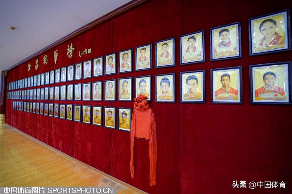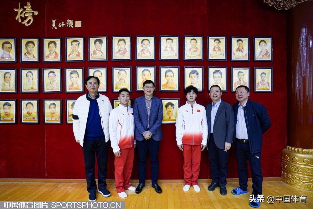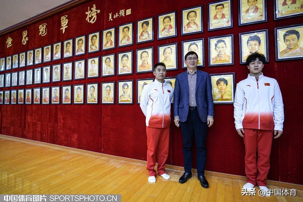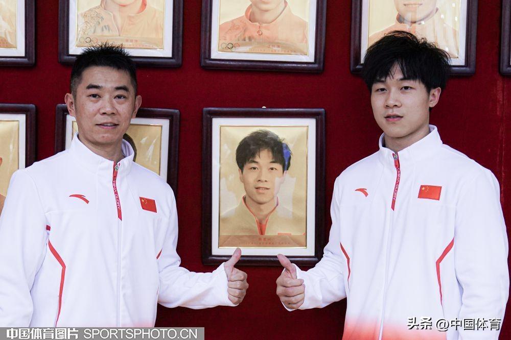 圖爲楊家興(右)與教練陸斌在冠軍牆前合影