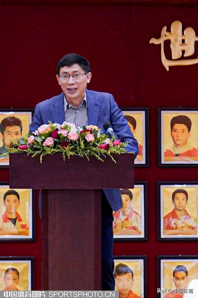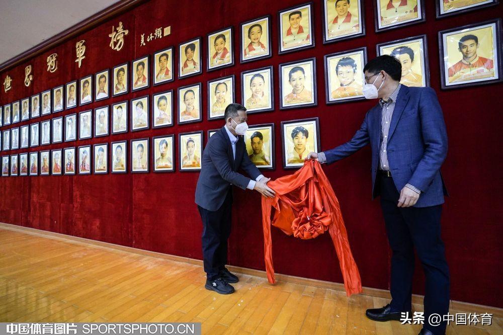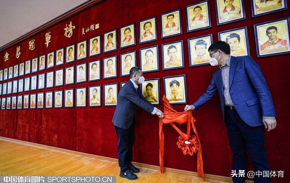 圖爲國家體育總局副局長周進強爲新世界冠軍楊家興揭榜,國家體育總局體中心主任繆仲一陪同揭榜