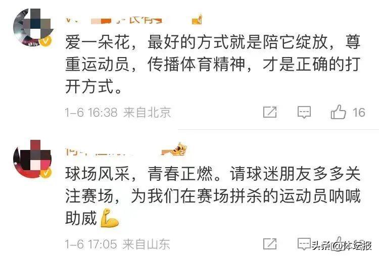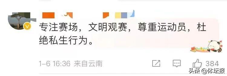希望廣大球迷專注賽場,尊重每位運動員所付出的汗水,熱愛體育,參與體育,從競技體育中收穫拼搏進取、團結協作的體育精神,纔是正確的打開方式”。