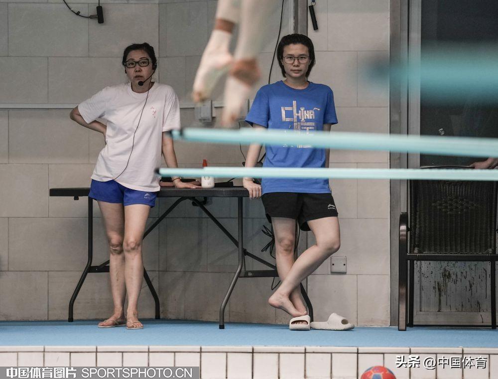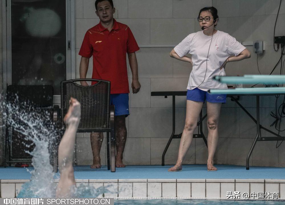 圖爲中國跳水隊領隊周繼紅(左)與教練施廷懋指導隊員訓練