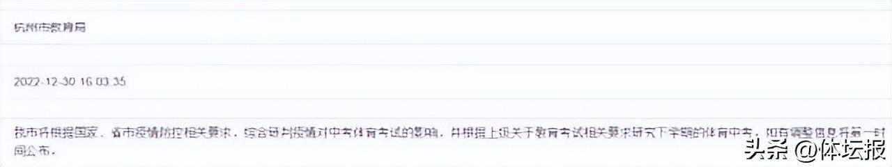 近日,杭州市教育局回覆稱,杭州市將根據國家、省市疫情防控相關要求,綜合研判疫情對中考體育考試的影響,並根據上級關於教育考試相關要求研究下學期的體育中考。如有調整信息將第一時間公佈。