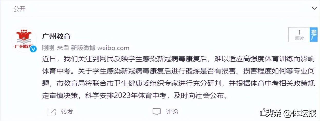 1月10日,廣州市教育局發佈通告,明確將根據體育中考相關政策規定審慎決策,科學安排2023年體育中考,及時向社會公佈。