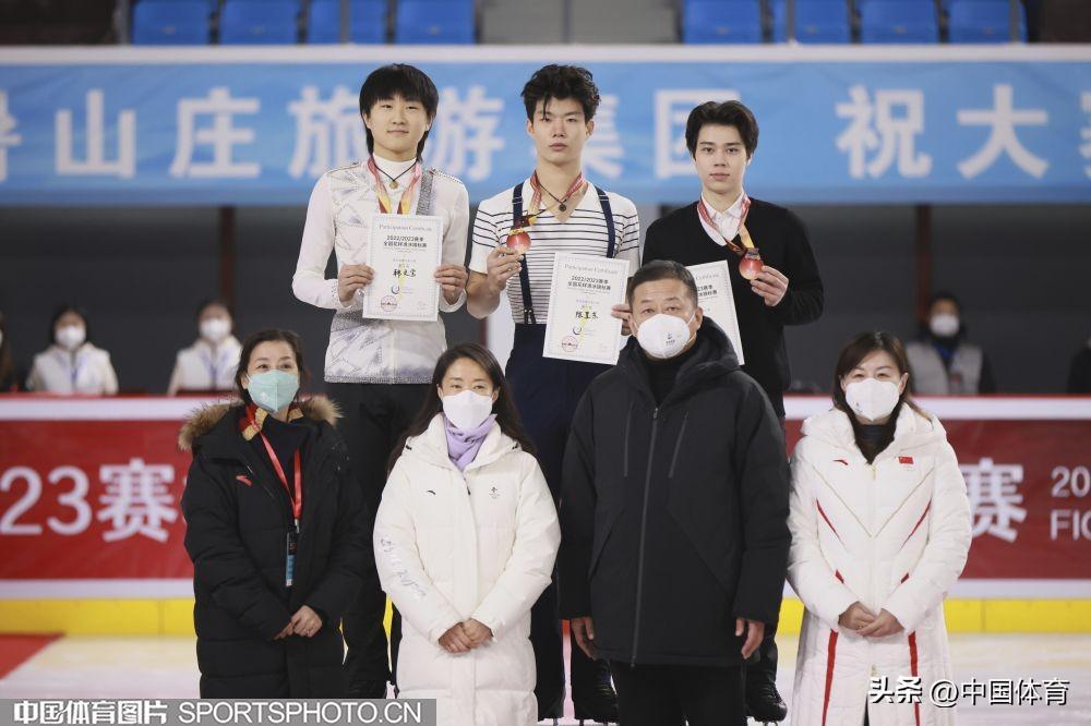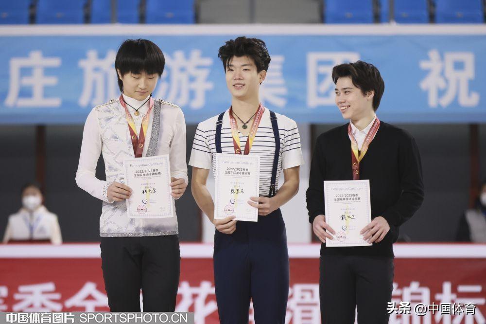 中國體育訊 1月12日,2022/2023賽季全國花樣滑冰錦標賽決出男單項目金牌。18歲小將陳昱東在自由滑比賽中獲得124.23分排名第一,最終以總分193分逆轉奪冠。韓文寶以總分191.70分摘得銀牌,戴大衛以總分188.69分獲得銅牌。(中國體育圖片 鹿麟 攝)