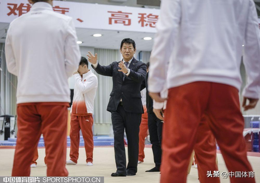 圖爲渡邊守成(左)與中國體操男隊隊員交流