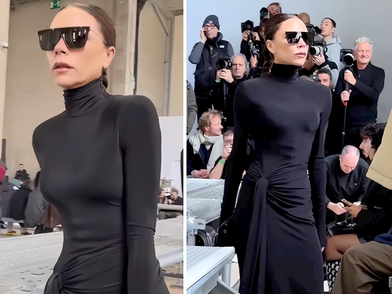 只見,維多利亞和丈夫貝克漢姆一起亮相Rick Owens 2023秋冬男裝大秀,穿上了她自己系列中的一件緊身連衣裙,爲了迎接冬天的天氣,裙子採用高領和長袖細節,然後收攏成繫帶,佩戴上墨鏡,顯得大氣又高貴,但看到這種風格造型,大腦自動聯想到金卡戴珊。