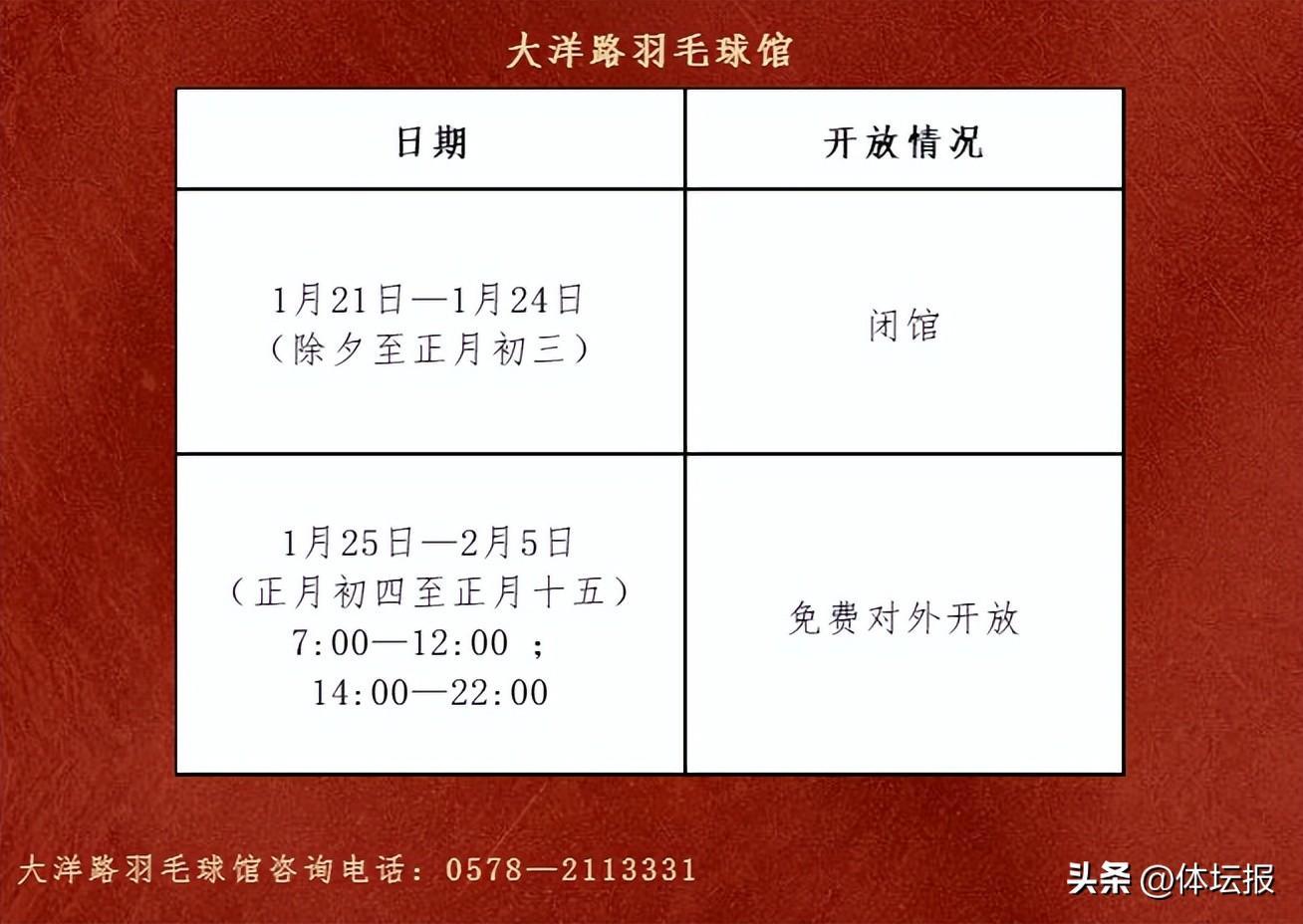 訓練館羽毛球場地 1月20日-21日歇業歡度春節。1月22日(正月初一)恢復正常開放時間。