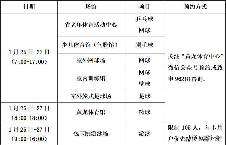1月25日至27日,省老年體育活動中心(乒乓球、網球)、少兒體育館(氣膜館)、室外網球場、室內訓練館、室外籠式足球場免費開放時間爲7:00-17:00;黃龍體育館免費開放時間爲8:00-18:00;包玉剛游泳場免費開放時間爲9:00-16:00。早場老年人活動場地,請根據線下老年早場使用通知進行預約。
