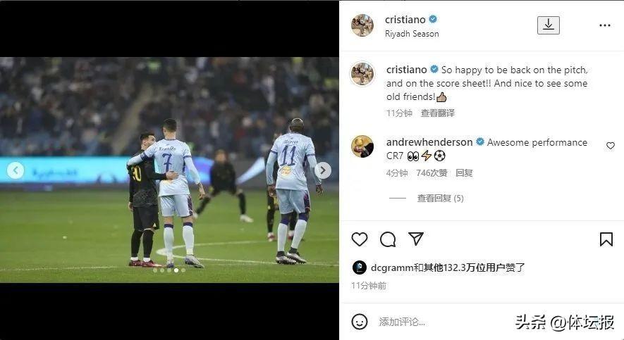 而心情不錯的他也在個人社媒曬出了自己在賽前與梅西相擁時的合影,以及進球后標誌性慶祝動作照片,配文寫道:“重回賽場太興奮了,並且再次取得進球!能見到一些老友感覺很棒!”