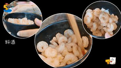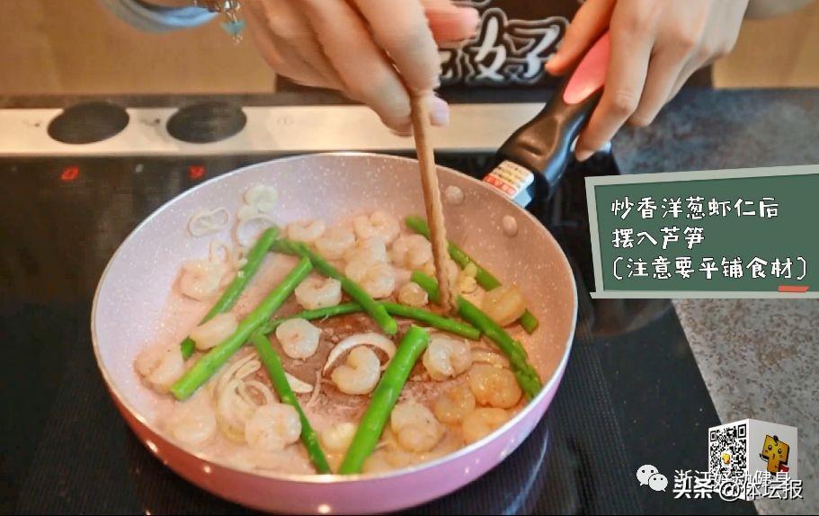 將蘆筍和蝦仁在鍋底鋪好,不要彼此重疊
