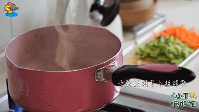 2、水開後把千張放下去,再次煮開後把胡蘿蔔絲放進去煮10秒,全部撈出備用。