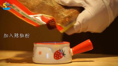 3、自制辣醬:配料剁碎後,澆上熱油。