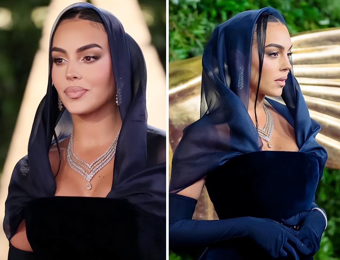 考慮到西亞國家對於女性裝扮的限制,喬治娜也只能相對保守,基本不敢在各種場合露肉秀身材,不過她倒是可以“肆無忌憚地”炫富,佩戴上各種鑽石耳墜和鴿子蛋戒指,衣服也是極盡奢華富貴,名媛範兒拉滿。