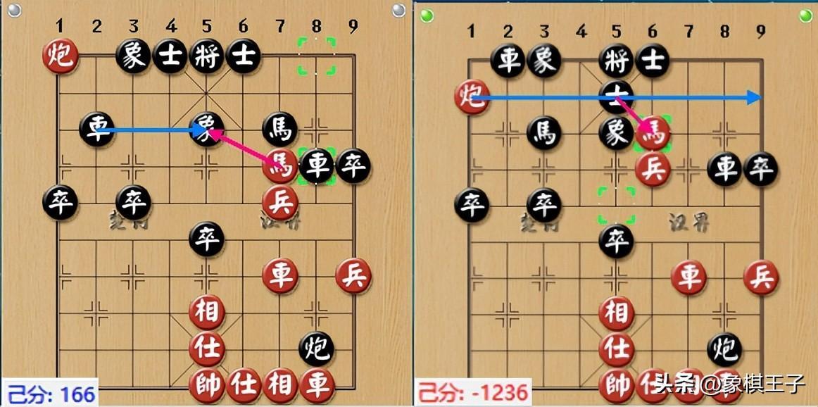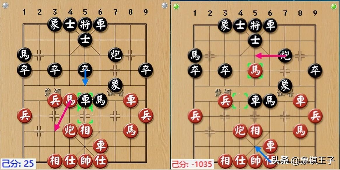 兩個棄子的變化之中,相差近千分,王天一緊湊連得兩子下來,果斷棄回一馬,喫去紅方底兵。