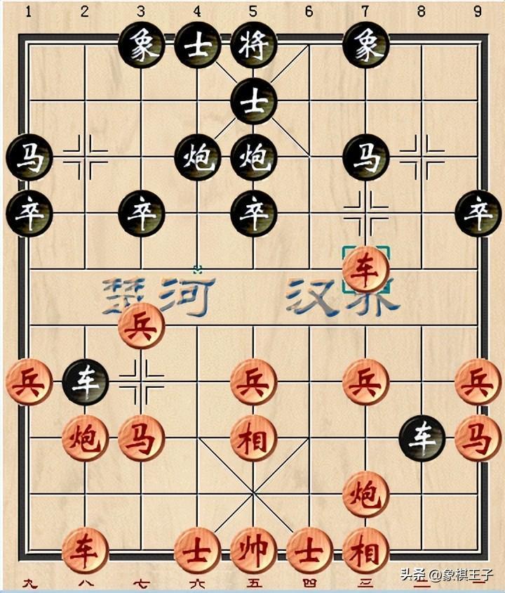 這是一個流行的佈局,黑伸車點炮,紅落炮,黑右車再過河,兩車齊進。