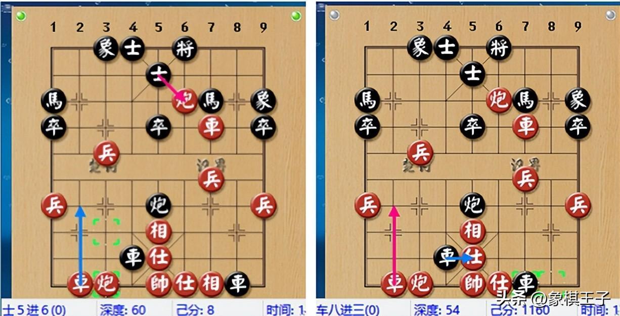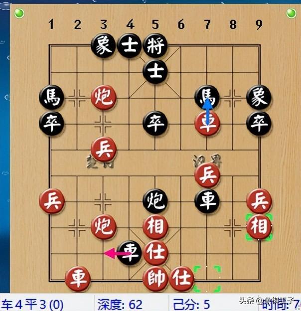 黑棋是如直接士喫炮,紅車砍中卒一將,黑上士,紅車回身殺炮,棋局紅有勢、黑多子,局面兩分,紅棋略好。