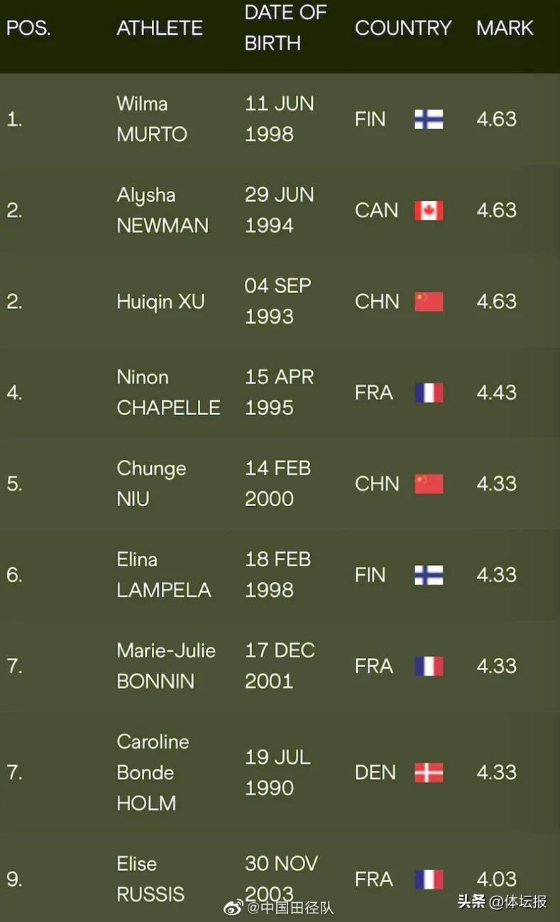 北京時間2月5日,在法國進行的2023年世界田聯室內巡迴賽女子撐竿跳高比賽中,中國選手徐惠琴以4.63米的賽季最好成績獲得並列第二名,另一位選手牛春格以4.33米的成績獲得第五名。