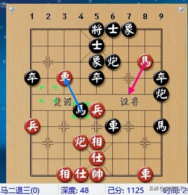紅方回馬再奔馬臥槽,黑同以撲馬臥襲,是下紅平炮擋住,黑方飛馬進來,踩踏紅棋二路車。