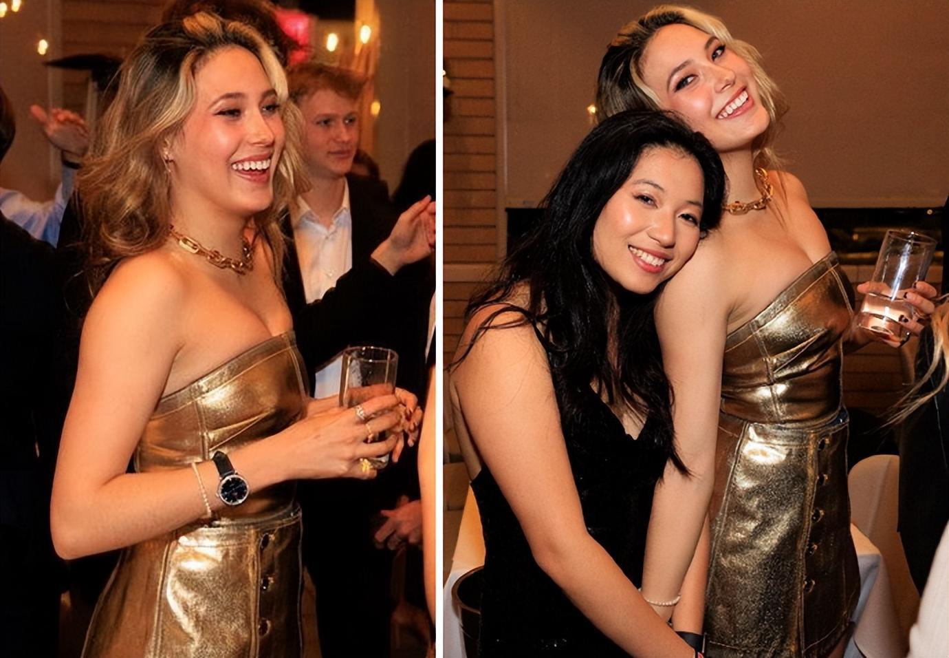 值得一提的是,晚宴現場,谷愛凌還換了兩套衣服,一件是金色的皮質抹胸緊身裙,酷勁十足,大秀性感鎖骨,並且勒出了事業線,女人味顯露;