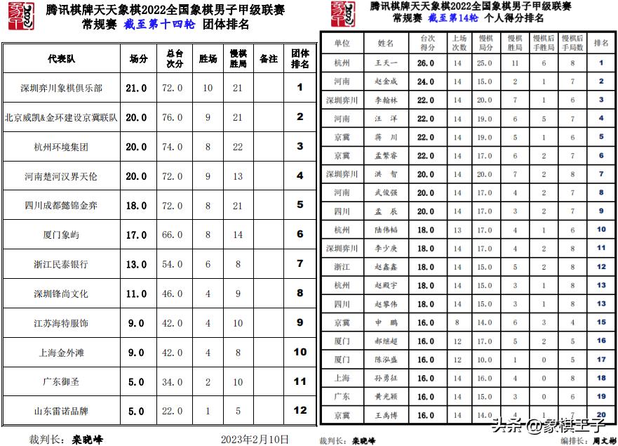 北京時間2月10日,2022年全國象棋男子甲級聯賽在江西萬載結束前三分之二賽程的火爆爭霸。最終兩大等級分第一王者狂演蓋世神功,第四位等級分第一王者、“玉面神佛”蔣川勇擒六連勝,二階段賽會無敵全捷,棋壇第一高手、連續十年等級分全國第一、“外星人”王天一十四戰13勝,高居射手榜第一。蔣王從賀歲杯、五羊杯起連戰十多天,弈超50局,京冀、杭州分居得分榜二、三,仍能戰鬥,堪爲鐵人。同樣神力的“洪天王”洪智率深圳昂佔第一,特大殺手孟辰接過三連冠四川大旗。2006年天才,呂欽許銀川新星傳人莫梓健全面爆發,二階段六戰5勝1負豪力崛起,比是時魔童孟繁睿的4勝2負還佳。