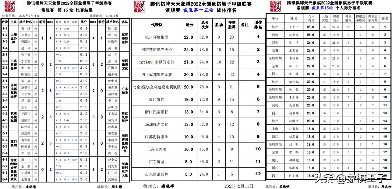 新杭軍戰力十足,沒有短板,十五輪後,九勝四平二負,22分高排榜首,總局分82,冠絕全場,慢棋勝局23,同樣第一,僅負二役,負率所有隊伍最低。