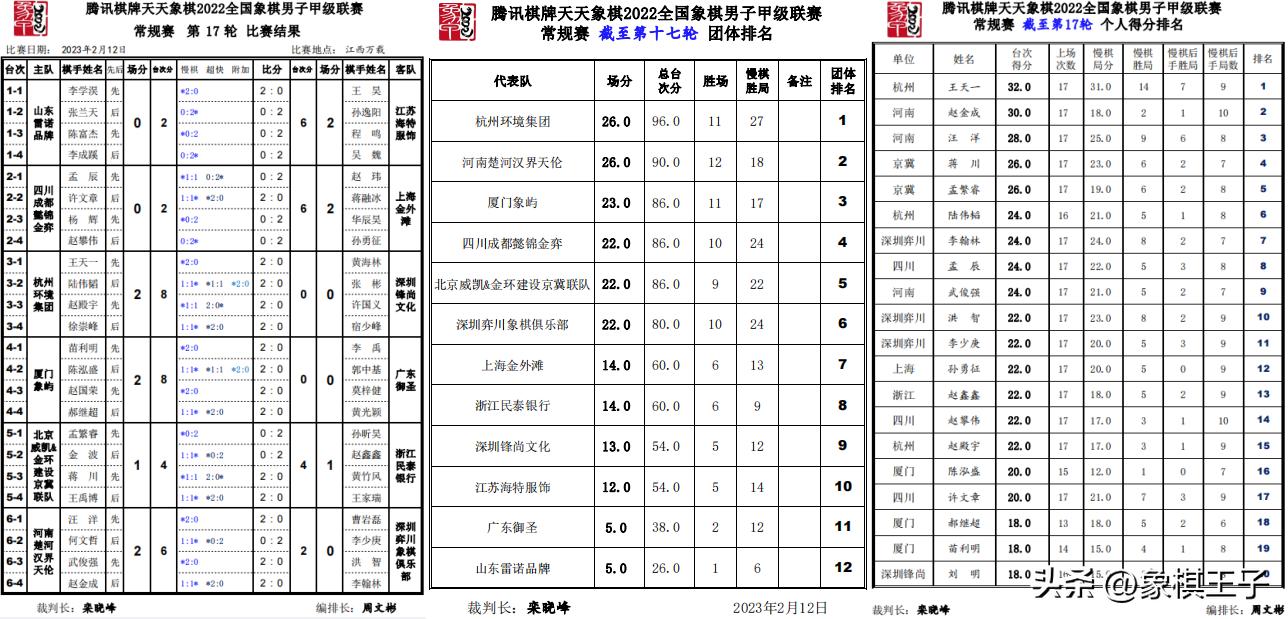 2月12日,象甲第17輪比賽在江西萬載戰罷,杭州隊擊敗深圳鋒尚隊,河南隊殺敗深圳隊,山東不敵江蘇,四川負於上海,廈門贏取廣東,京冀打平浙江。