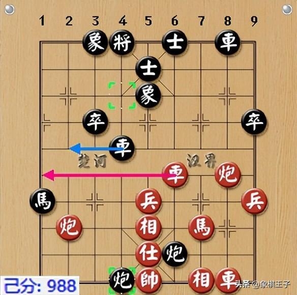 紅若車四平九騰空捉馬,下伏炮二平六打將,黑車4平2對抓紅炮,紅車退一喫馬,黑車喫炮,紅平車做將,黑進將,紅退車殺炮,白喫一炮且無風險,當即成勝。
