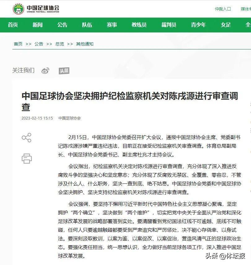 2月15日,中國足球協會黨委召開擴大會議,通報中國足球協會主席、黨委副書記陳戌源涉嫌嚴重違紀違法,目前正在接受紀檢監察機關審查調查。