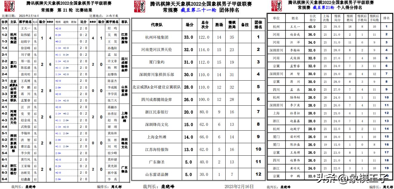 象甲聯賽戰罷二十一輪,杭州33分持續第一,河南32分緊跟,廈門31分,深圳30分,京冀28分,四川26分,浙江20分,深鋒尚15分,上海14分,江蘇13分,廣東、山東5分。