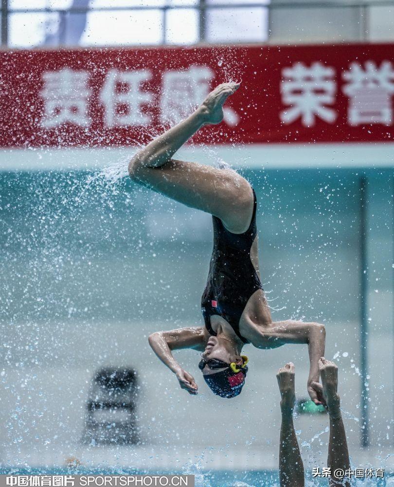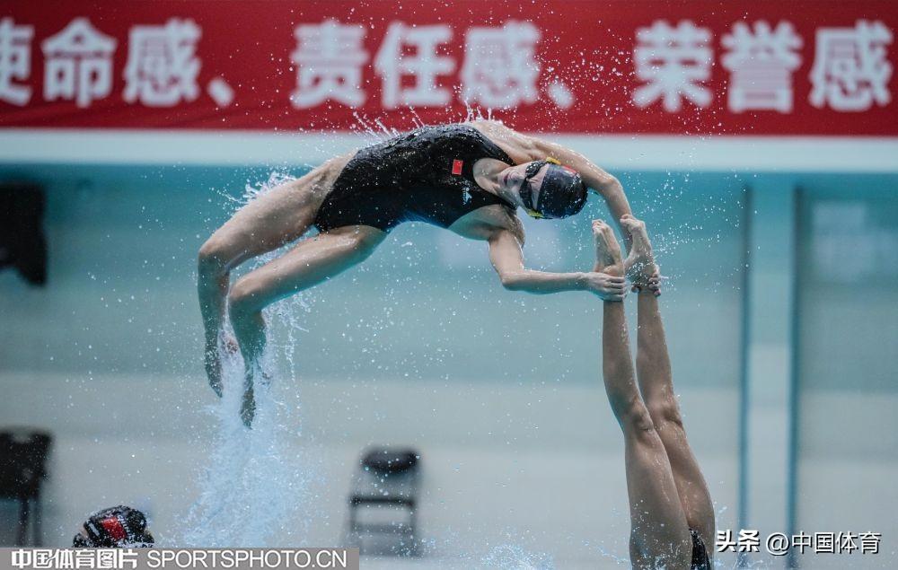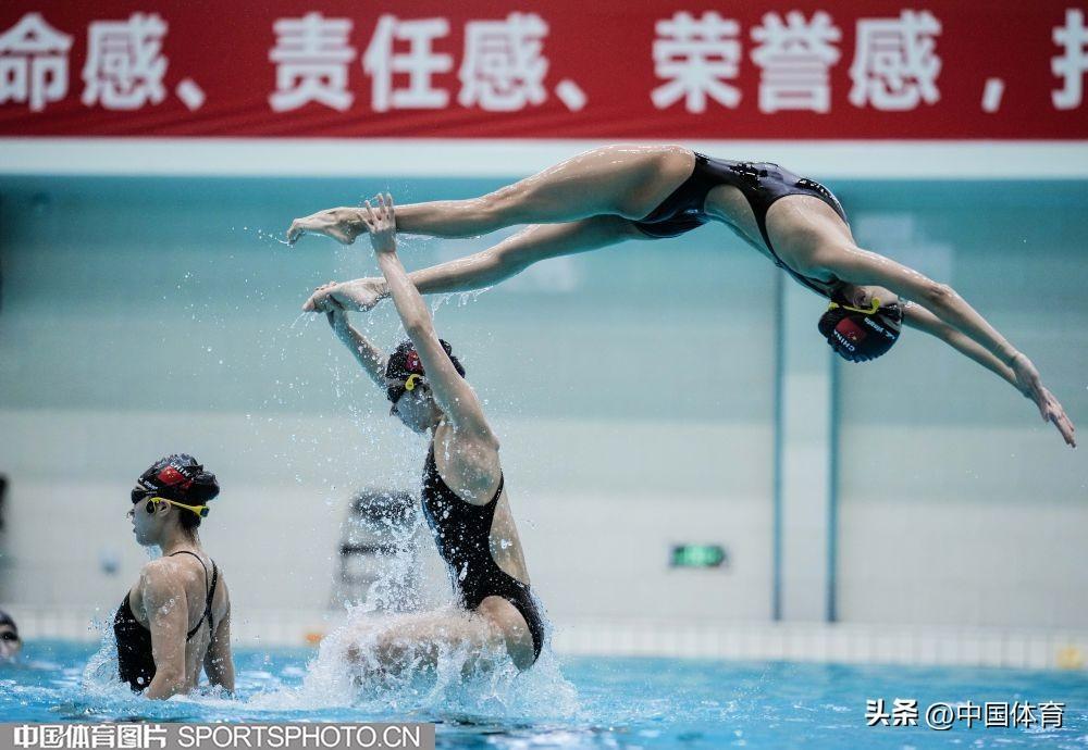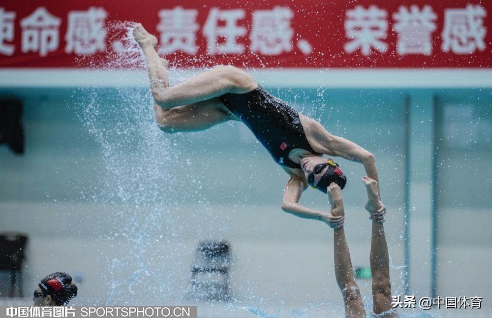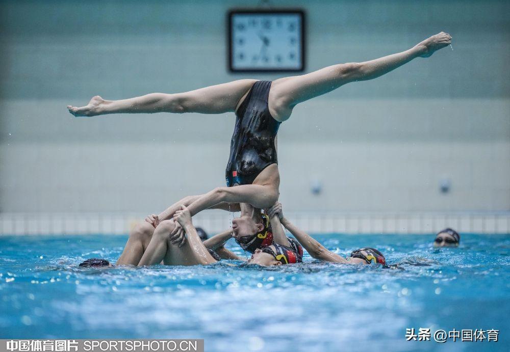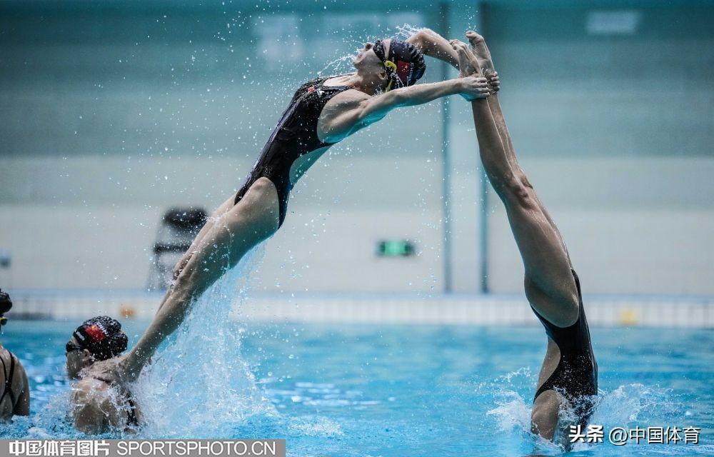 圖爲中國花樣游泳隊集體項目選手在進行託舉訓練