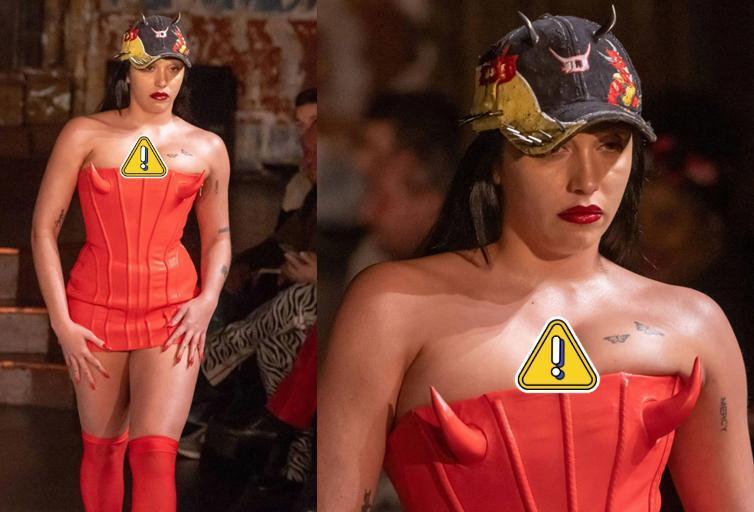 盧爾德-里昂先是穿了一件紅色的“小魔鬼”系列緊身連體裙,但不得不說,麥當娜女兒的身材確實不好,骨架粗壯,身上的肉也很多,略顯臃腫,感覺費了很大力氣才把自己塞進裙子裏似的。