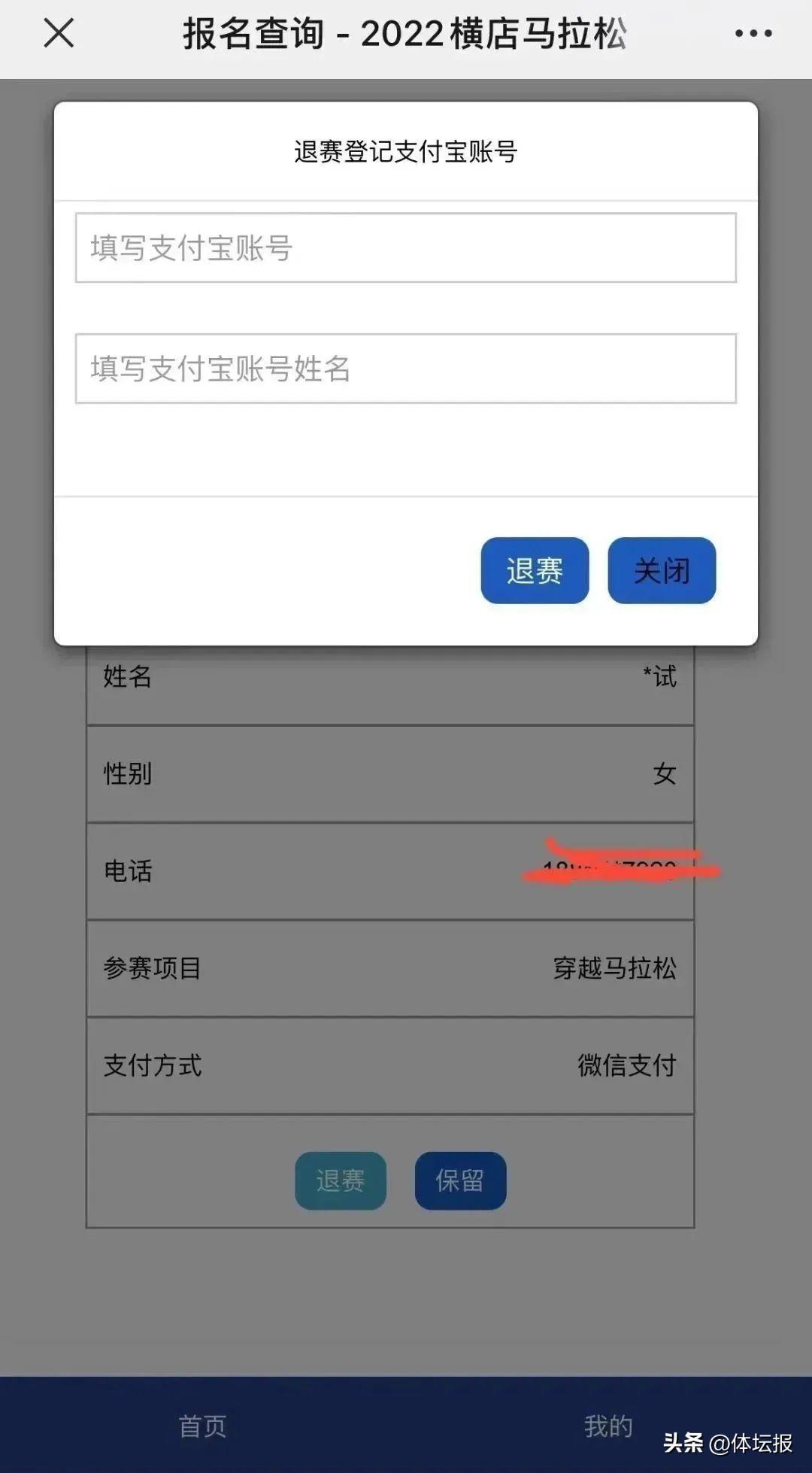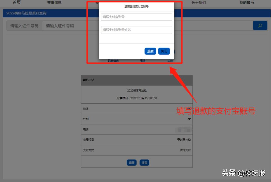 輸入身份證號碼,查詢到自己的具體報名情況,點擊“退賽”按鈕,並在彈窗輸入退款的支付寶賬號,完成退款流程。