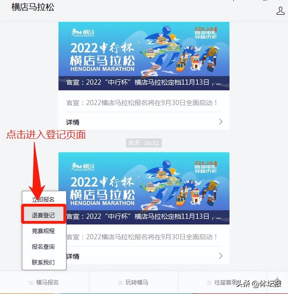 通過“橫店馬拉松”微信公衆號,在“橫馬報名”欄目找到“退賽登記”項目點擊進入。