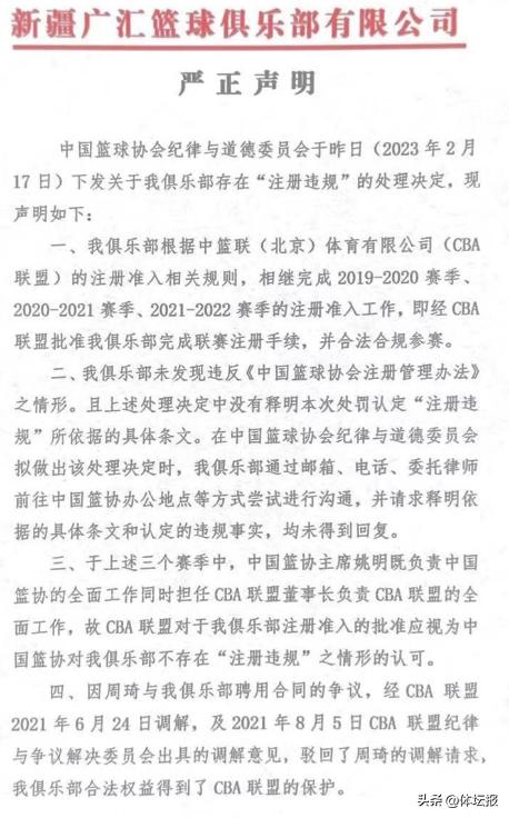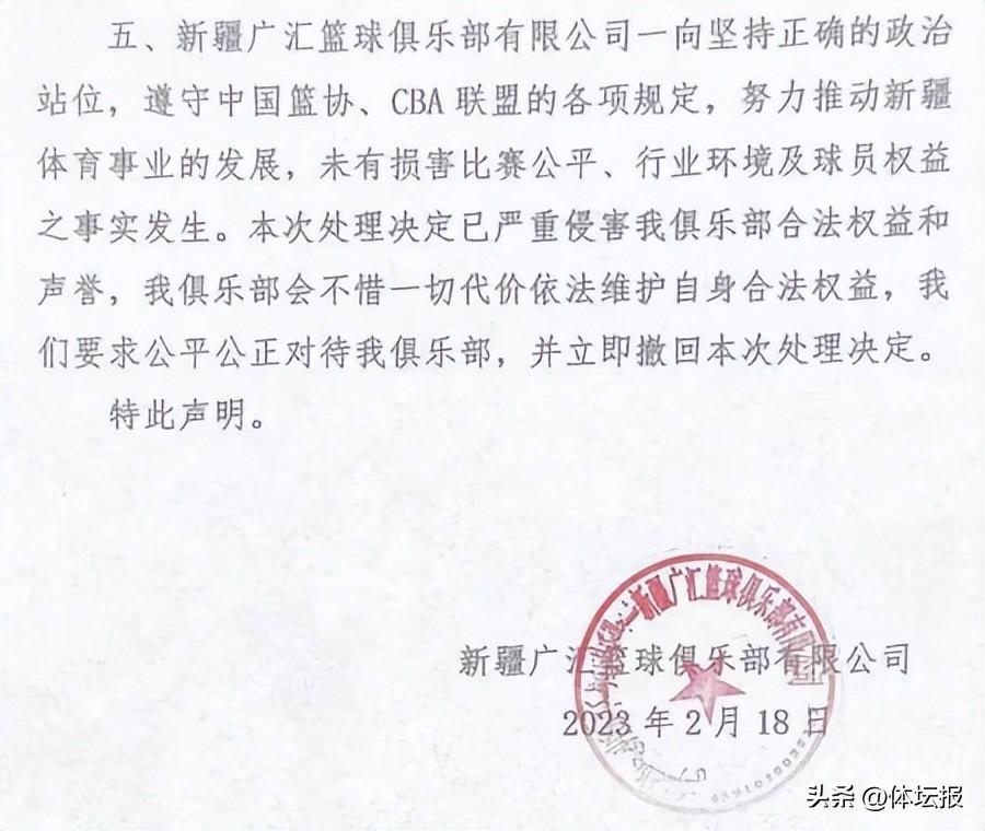 隨後,新疆隊發佈公開聲明,不承認自己違規要求撤銷處罰,並在聲明中點名質疑姚明。