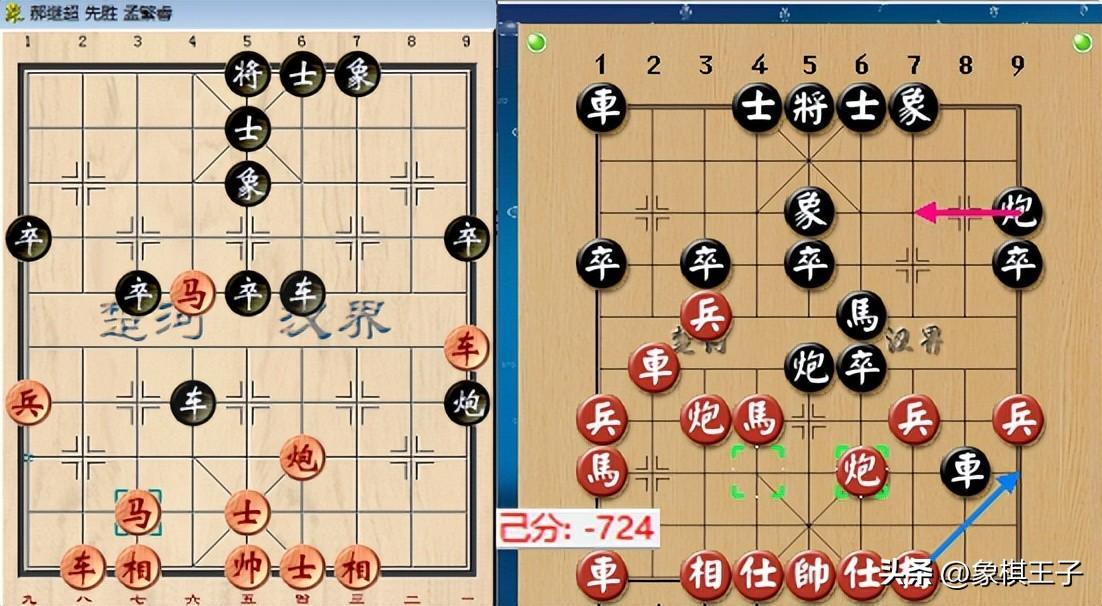 局間棄子搶攻,已反先逾700分的情況下,一個炮9平7平炮打相,炮7進2,馬6進4送馬打車,伏炮7平5重炮製殺。