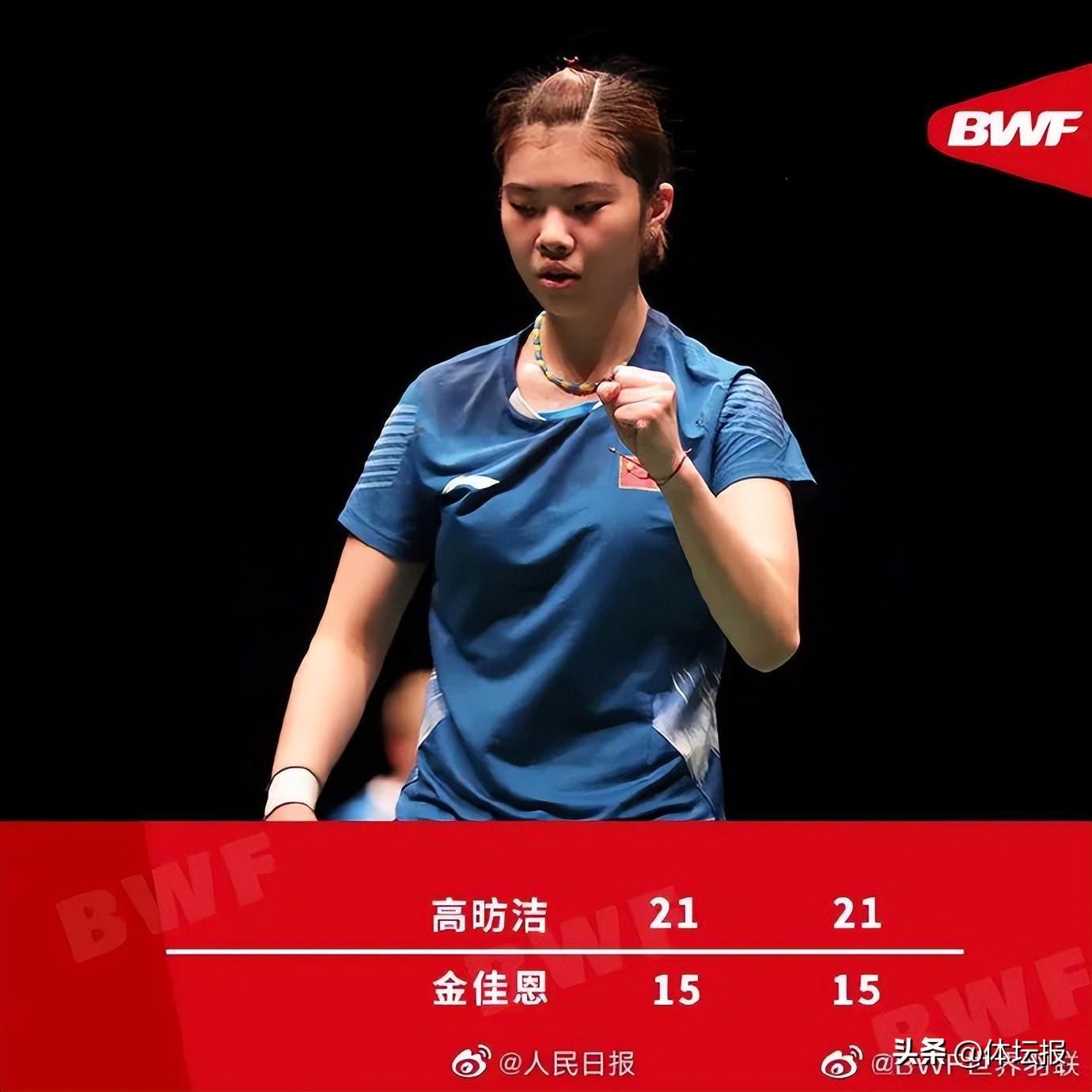女單對決中,中國選手高昉潔以2:0(21:15/21:15)戰勝韓國選手金佳恩,再下一城。