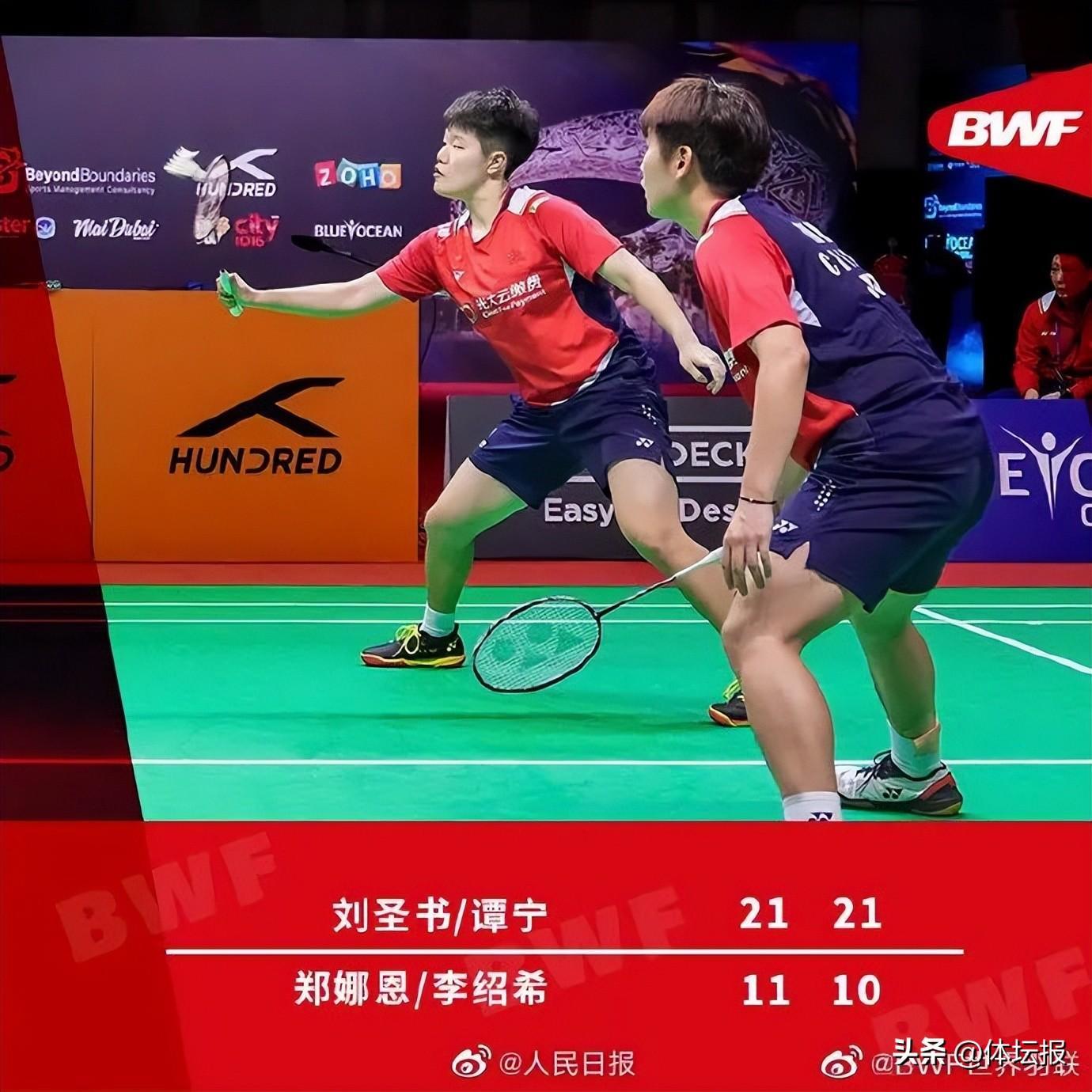 女雙之戰中,中國選手劉聖書/譚寧以2:0(21:11/21:10)戰勝韓國選手鄭娜銀/李紹希,中國隊就此摘得冠軍。