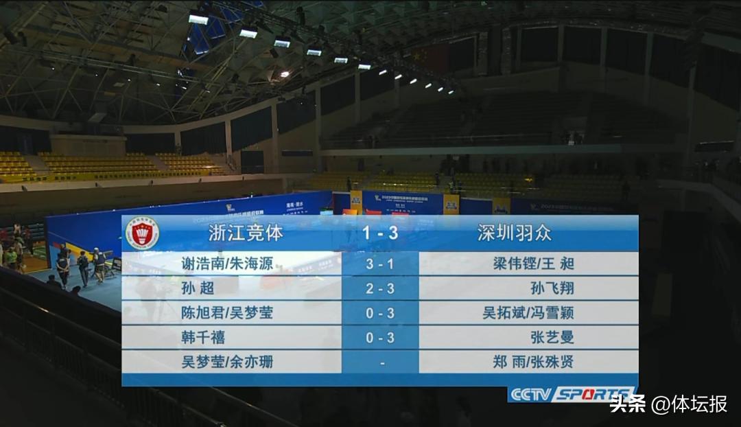 混雙比賽,面對在全國冠軍賽中擊敗過自己的老對手馮雪穎和她的搭檔吳拓斌,吳夢瑩和搭檔陳旭君還是在經驗和技術上略遜一籌:第一局7:11失利後,之後兩局在關鍵分上未能成功反擊,10:12、9:11連續惜敗兩局。隨着韓千禧在女單0:3不敵張藝曼,浙江競體以1:3不敵深圳羽衆,第四名收官本屆羽超聯賽。