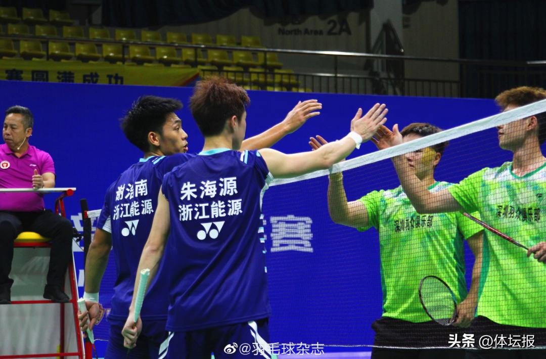 在首先進行的男雙比賽中,浙江競體遣出謝浩南/朱海源組合,面對同門師兄、國家隊成員王昶和搭檔梁偉鏗拿出了更高的鬥志,一上來就11:4 、11:7連下兩局, 在以7:11遺憾丟掉第三局後,決勝局他們以11:3 乾脆利落地解決戰鬥,爲浙江拿下首個積分。