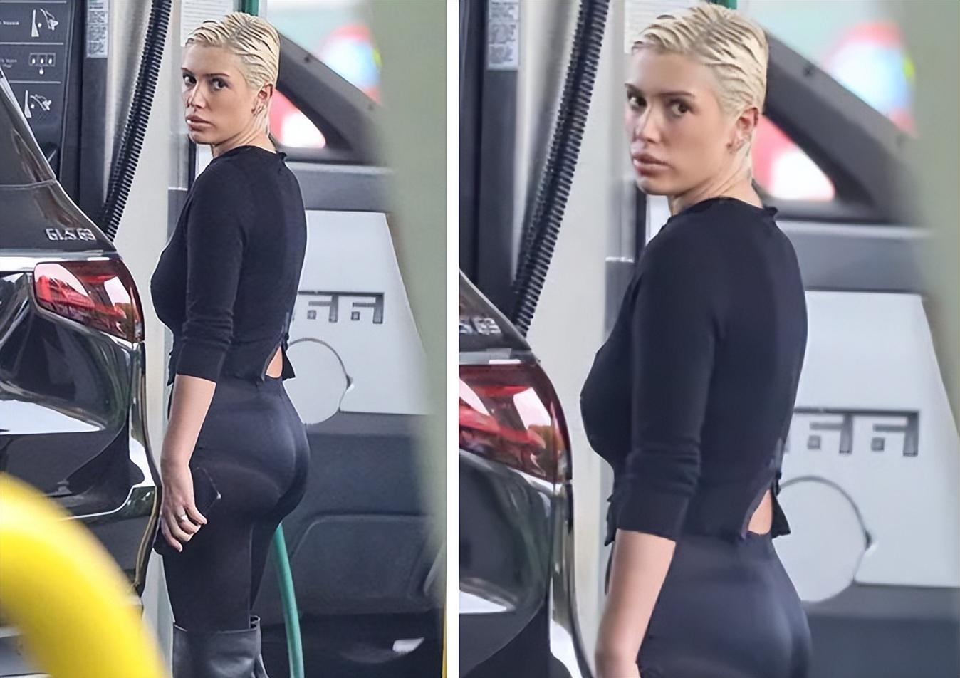 比安卡一頭銀白色的短髮,非常幹練,英姿颯爽的樣子,而她穿了一身黑,不過特意露出了自己性感的肚臍位置,有一點猶抱琵琶半遮面的感覺,側身加油的時候,比安卡的S曲線非常明顯,臀部很翹,腰又很細,絲毫不輸給侃爺的前妻金卡戴珊。