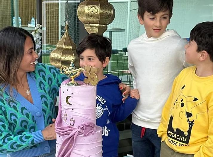 從最新曬出的生日派對照片可以看出,35歲的“壽星”安東內拉即便自己過生日,也穿得非常樸素,一條普通的牛仔褲,搭配綠色花紋的針織外套,完全沒有“球王夫人”的奢華感。