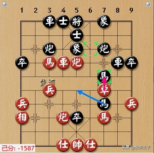 紅棋無法,只有馬六進七踏進去,尋常看,子力過河,又是都壓在對方的卒線要道,是好的。