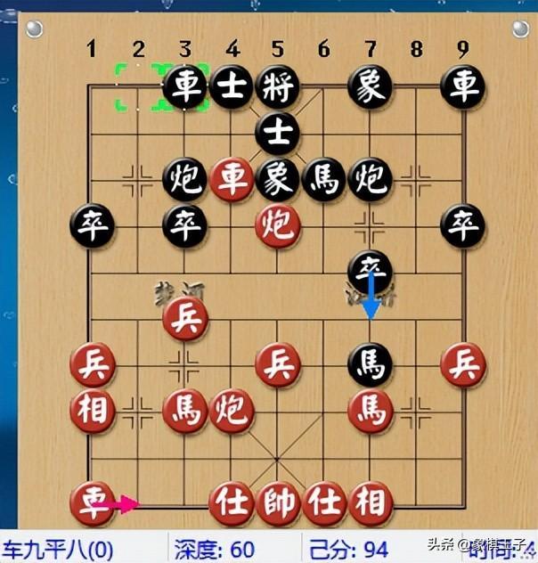 紅方無可奈何,車九平四強行過來,阻止黑棋馬7退6的回馬蹬車,奪攻三子計劃。
