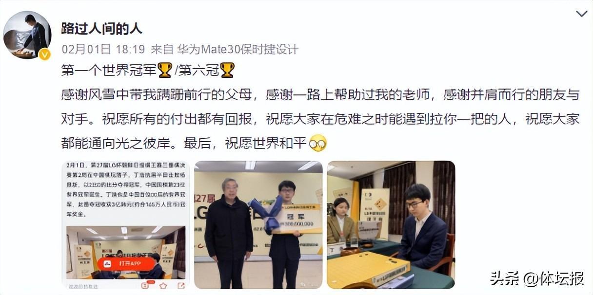 LG杯奪冠後,丁浩在微博上發文回顧過去,並感謝大家:“第一個世界冠軍&第六冠,感謝風雪中帶我蹣跚前行的父母,感謝一路上幫助過我的老師,感謝並肩而行的朋友與對手。祝願所有的付出都有回報,祝願大家在危難之時能遇到拉你一把的人,祝願大家都能通向光之彼岸。”