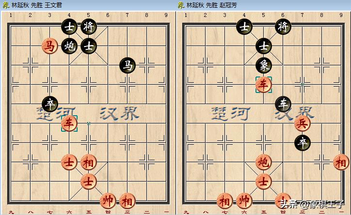 時鳳蘭擔子炮聯手,退炮打死車,得車大勝,終盤時,雙車雙馬炮雙卒單缺士對車雙馬炮三兵仕相全,淨多一車,威猛。