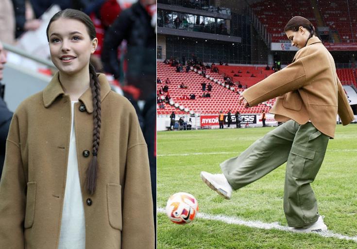 只見,19歲的謝爾巴科娃穿着米黃色的大衣,一條寬鬆的闊腿褲,走到球場中央,一腳開球,非常瀟灑,現場球迷也響起了巨大的歡呼聲,“小千金”可愛比心,給看臺致意。
