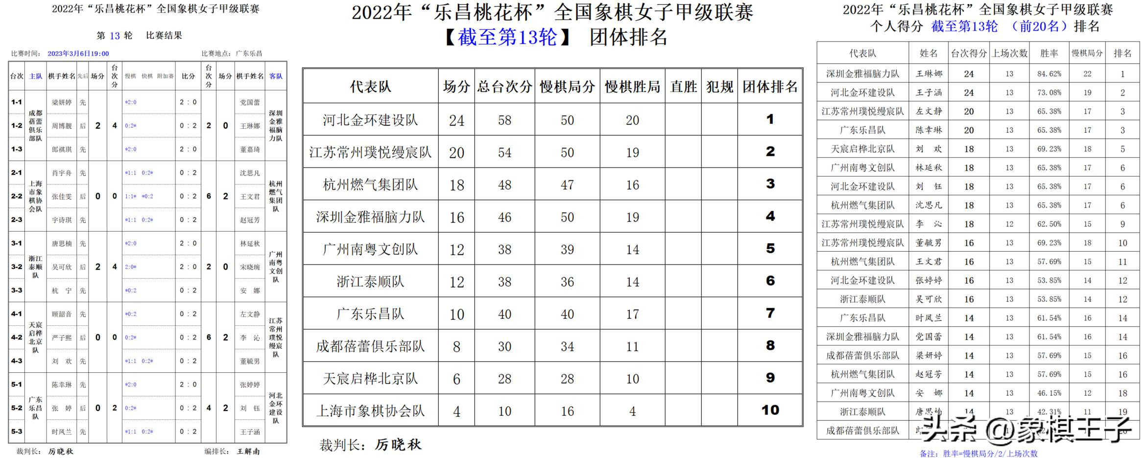3月6日,女子象甲第13輪比賽在廣東樂昌戰罷,四川隊擊敗深圳隊,杭州隊贏下上海隊,廣州不敵浙江,北京負於江蘇,河北贏取廣東。