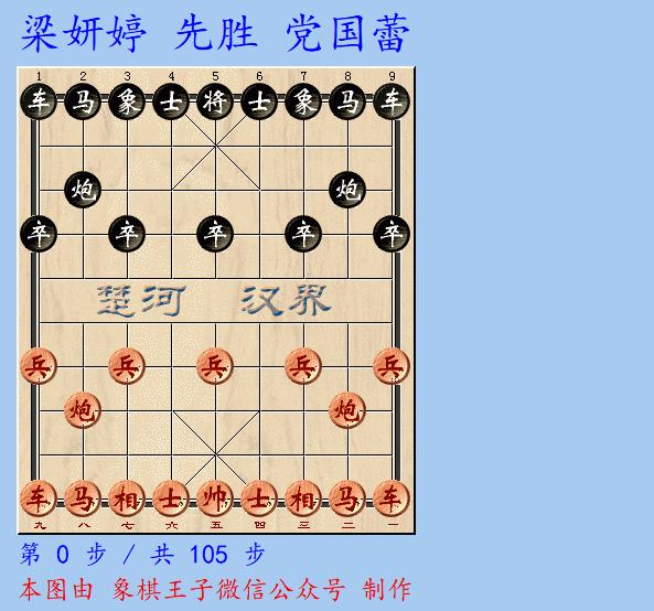 梁妍婷對壘女子冠軍黨國蕾,這盤會戰,梁妍婷先手落出了中炮陣,黨國蕾應以反宮馬。