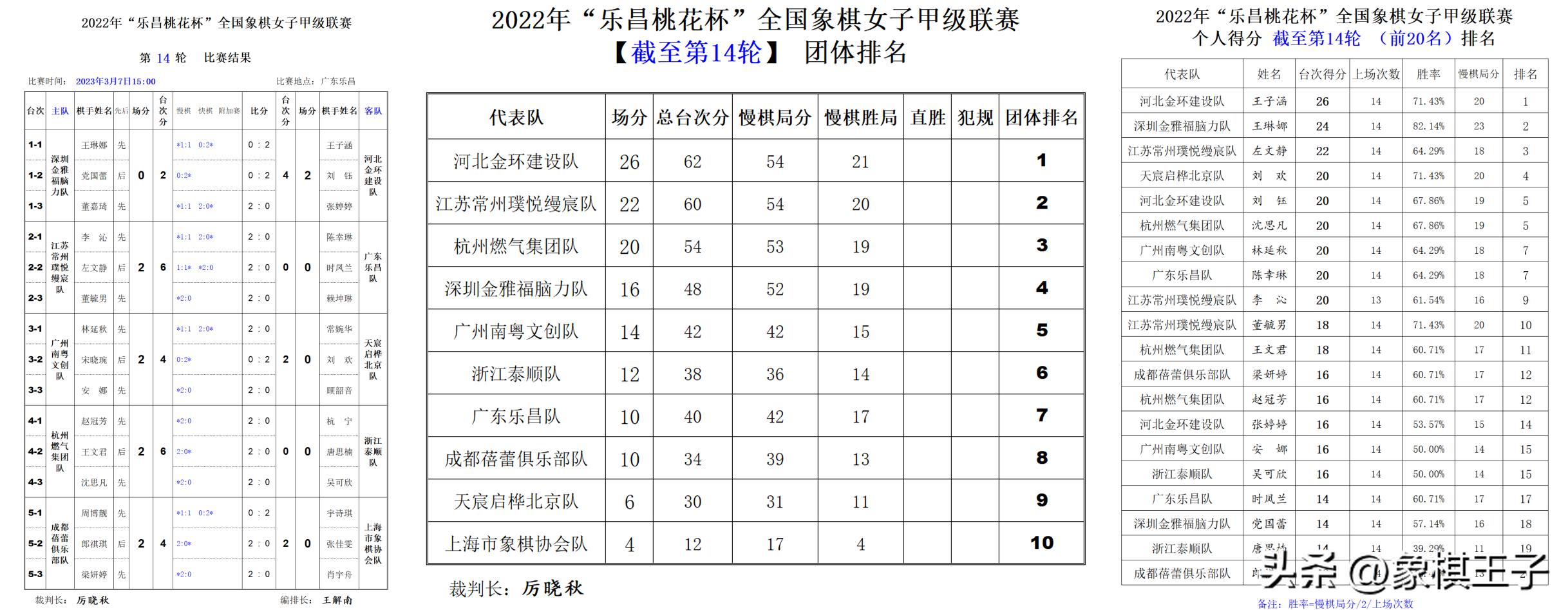 3月7日,女子象甲第14輪比賽在廣東樂昌戰罷,河北隊擊敗深圳隊,江蘇隊贏下廣東隊,廣州取勝北京,杭州大勝浙江,成都贏取上海。
